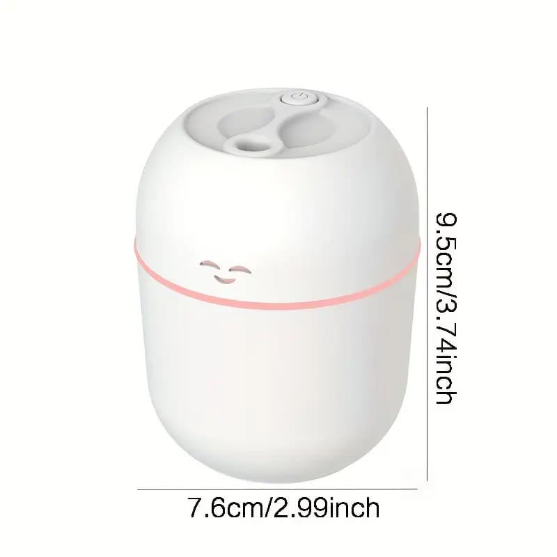 Compact USB humidifier with LED light. Perfect for car, bedroom, and office use.